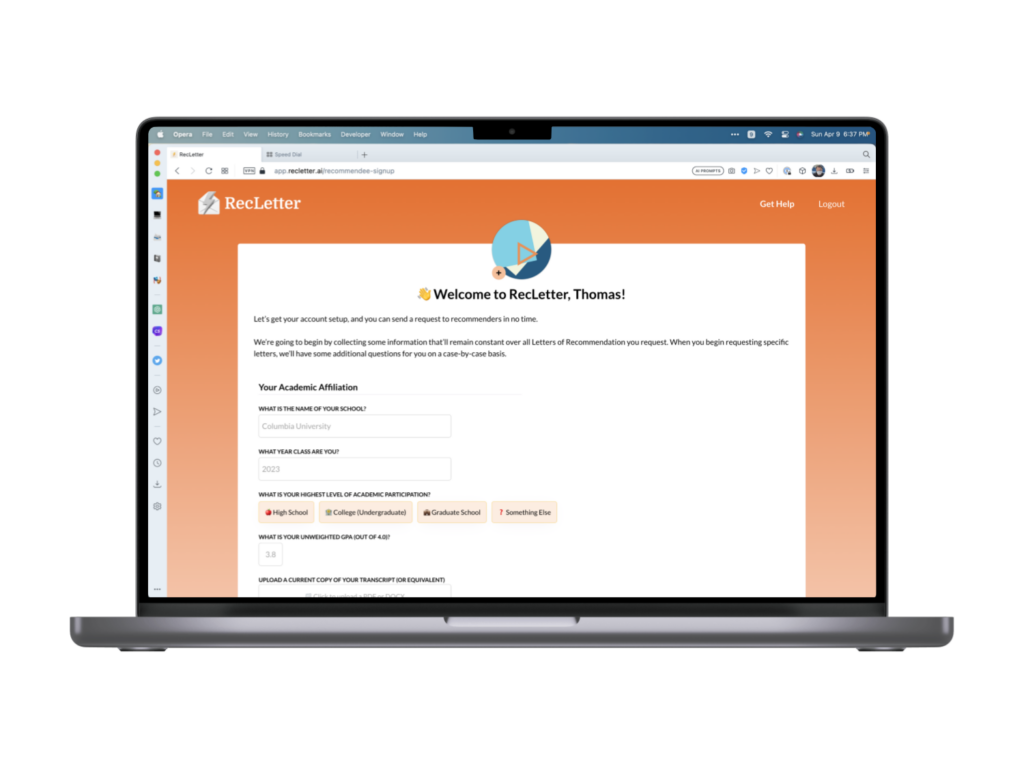 First, create your RecLetter.ai account. Sign up as a ‘Recommendee’, and you’ll be asked some questions about your academic affiliation and GPA.